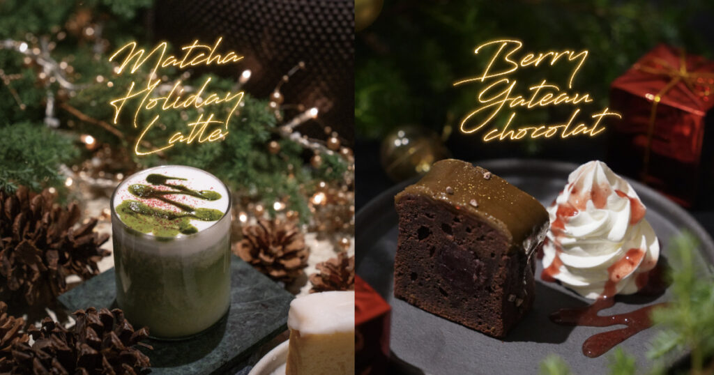 店内利用の「抹茶ラテ」「ガトーショコラ」がちょっぴりクリスマスの装いで登場。